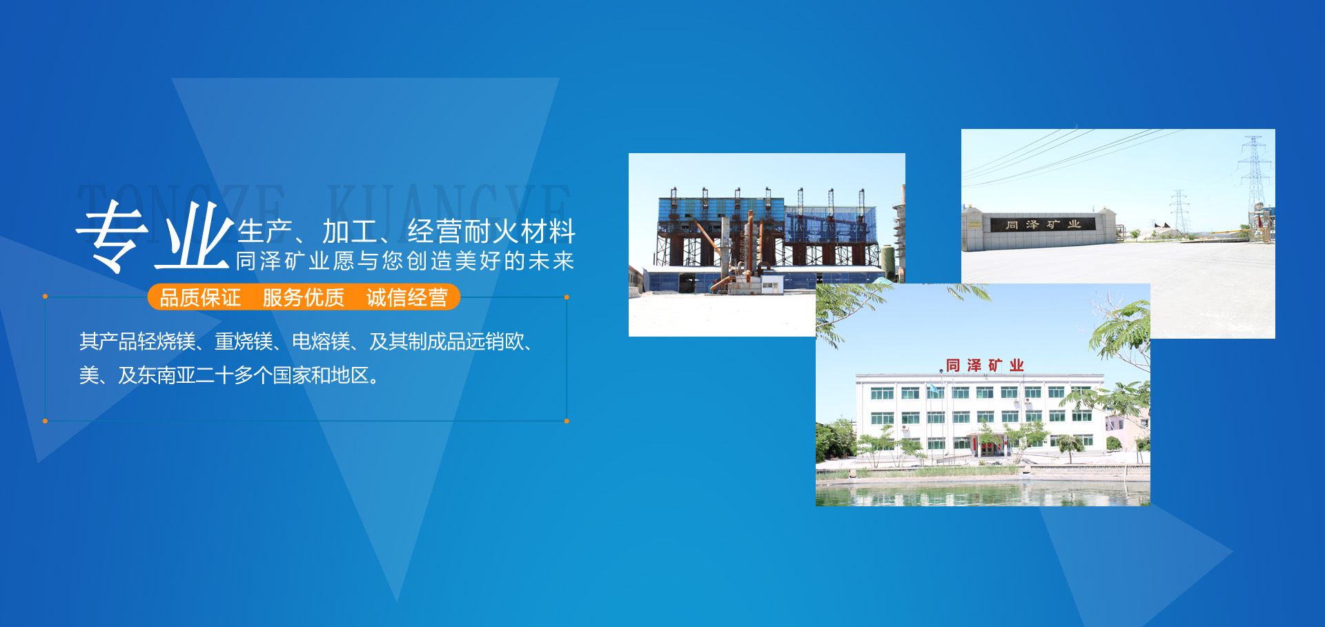 大石橋市同澤礦業(yè)有限公司,是以生產(chǎn)、加工、經(jīng)營各種耐火材料為主的綜合性經(jīng)濟(jì)實體。其產(chǎn)品輕燒鎂、重?zé)V、電熔鎂、及其制成品遠(yuǎn)銷歐、美、及東南亞二十多個國家和地區(qū)。